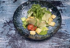 Салат Цезарь с яйцом пашот и вялеными томатами с креветками гриль