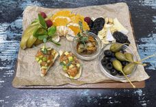 270 г • кростини с тар-таром из лосося, креветки гриль, каперсы, оливки, сыр Бри, ягоды свежие, виноград, апельсин