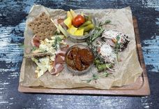 270 г • кростини с ростбифом из говядины, парма, сыр Дор Блю, Пармезан, огурчики маринованные, вяленые томаты, сухофрукты, орехи