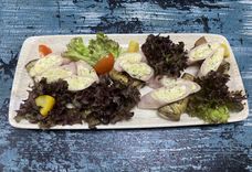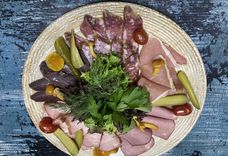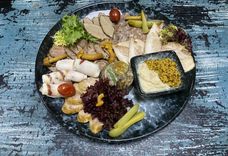 370/130/30 г • домашний сальтисон, домашняя колбаска, копченая утиная грудка ростбиф заливное из телячьей ножки, сальце с травами и луком
