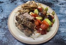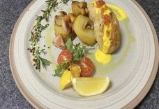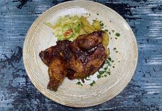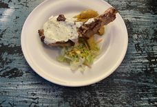 250/100/50 г • с чесночным соусом, свежими овощами, картофелем по-деревенски