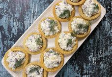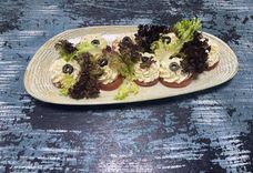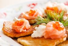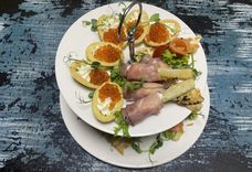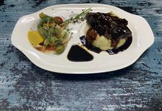 125/150/73 г • подаются с картофельными дольками, белыми грибами и красной икрой