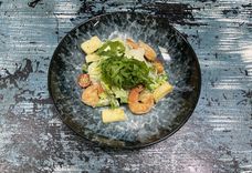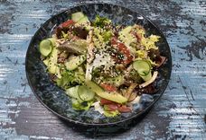 210/7 г • салат ромен, салат айсберг, перец маринованный, томаты, лук порей, говядина обжаренная на гриле, майонез+соевый соус
