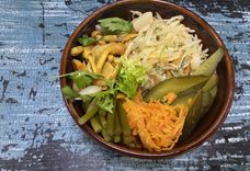 180/40 г • морковь, картофель, огурец солёный, капуста квашенная, горошек, яйцо отв., майонез, язык