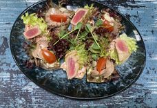 190/43 г • огурцы, томаты, лук красный, чили перец, свинина гриль, кунжут, соевая заправка
