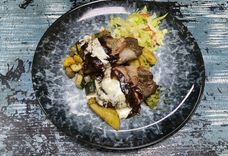 135/185/30/5 г • медальоны из говядины в сочном беконе с овощной капонатой и картофельными дольками