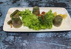 Фирменное заливное из языка с соусом «Сливочный хрен» и соленьями
