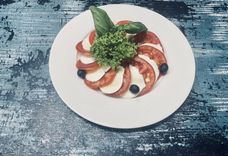 Моцарелла с сахарными томатами, базиликом, гуакамоле и соусом «Песто»