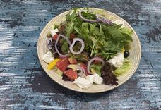 200/30 г • смесь салатов, перец сладкий, томаты розовые, огурец, оливки, маслины, заправка с оливковым маслом, фета