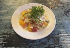 200/22 г • салат айсберг, салат ромен, руккола, ростки сои, томат черри, курица с маракуйей и кокосовым молоком, миндаль слайсы, мандарины дольками
